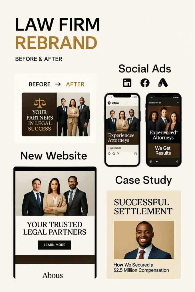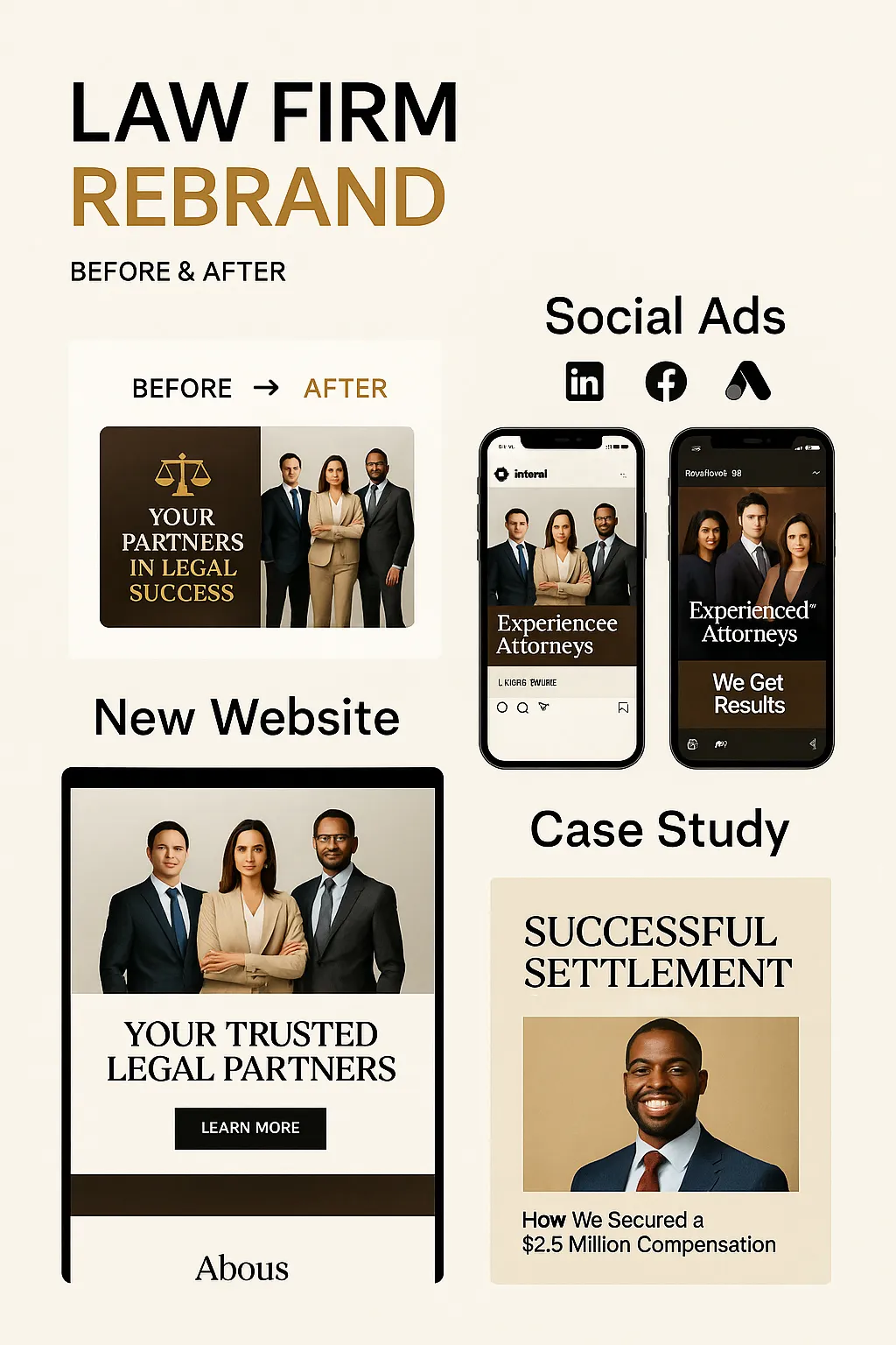 We executed a brand repositioning that included a sophisticated serif wordmark logo with an ampersand detail, a refined color palette (navy, slate gray, champagne gold), and a consistent corporate-focused brand voice.